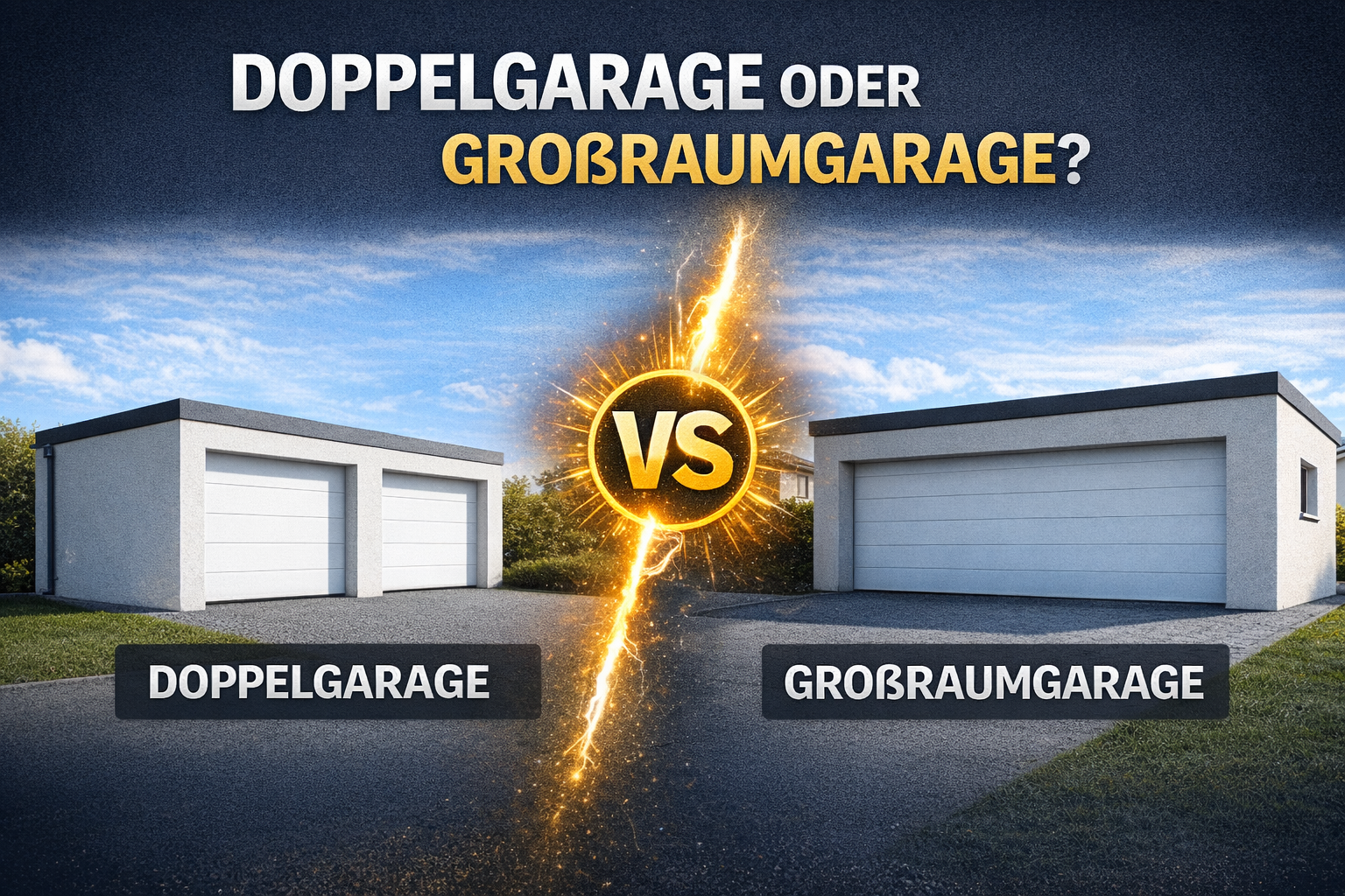 Doppelgarage und Großraumgarage sind in vielen Fällen von der Grundfläche her gleich und können beide zwei Fahrzeuge und Stauraum abdecken. Der Hauptunterschied liegt im Konzept: zwei Tore bei der Doppelgarage gegenüber einem breiten Tor bei der Großraumgarage – und damit vor allem in Optik und Frontwirkung.